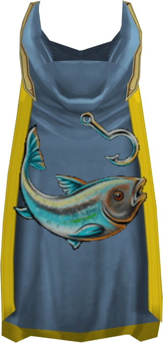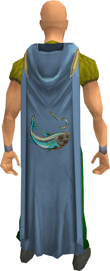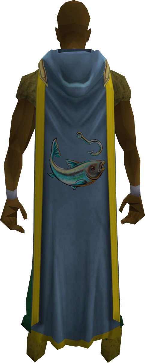 The hooded fishing cape (t) is the Cape of Accomplishment for the Fishing skill. It can be purchased for 99,000 coins alongside the Fishing hood from the Master fisher standing inside the Fishing Guild by players who have achieved level 99 in Fishing. Fishing capes are light blue in colour if untrimmed, and have a gold trim if the player has more than one level 99 skill.