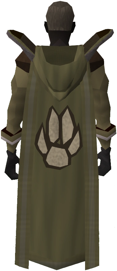 The hooded hunter cape is the Cape of Accomplishment for the Hunter skill. It can be purchased for 99,000 coins alongside the Hunter hood from the Hunting expert located in the Feldip Hills, by players who have achieved level 99. Hunter capes are brown in colour and have a dark brown trim if the player has more than one level 99 skill.