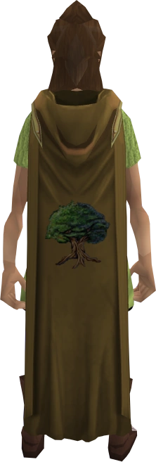 The hooded woodcutting cape is the Cape of Accomplishment for the Woodcutting skill. It can be purchased for 99,000 coins alongside the Woodcutting hood from Wilfred (who can be found wandering through the trees north-west of the north exit of Falador) by players who have achieved level 99 Woodcutting. Woodcutting skillcapes are light brown in colour, and have a green trim if the player has more than one level 99 skill.