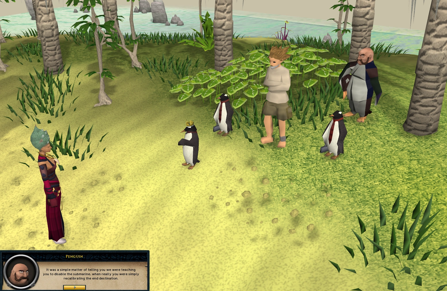 You see another cutscene, where you end up on a deserted island south-east of Ape Atoll. It turns out, you were being used by Penguin King Pescaling Pax to save him the effort of capturing the submarine himself, and the access to the penguin lair was part of the plot. The dwarves were not in fact captured slaves at all but were part of a splinter group from the Red Axe faction that seek domination over humans—and thank you for providing them with clockwork suits. Larry is bundled off to the Motherland, and you are left to die a slow death on the deserted island. You cannot access your inventory or spellbook, and are thus unable to teleport off the island (you can still teleport off of the island using lodestone hotkeys, but it is not recommended to do so).
