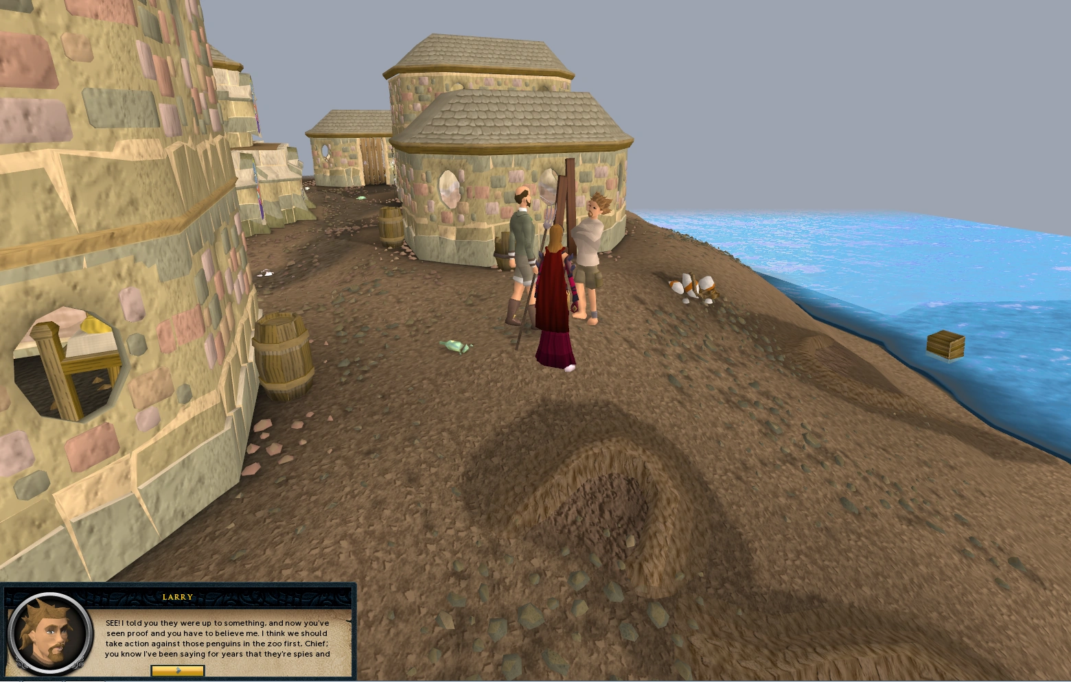 Return to Larry, and show him the telegram. You cannot take off the penguin suit for a quick exit as you will lose the telegram and have to go through the maze again. Logging out will get you to the main hall and the telegram in your inventory removed. Larry tells you to meet him on the coast east of Yanille, with all your necessary supplies, including your clockwork suit, Conch shell, toolbox, and the fish hat that have been worn by captured penguin.