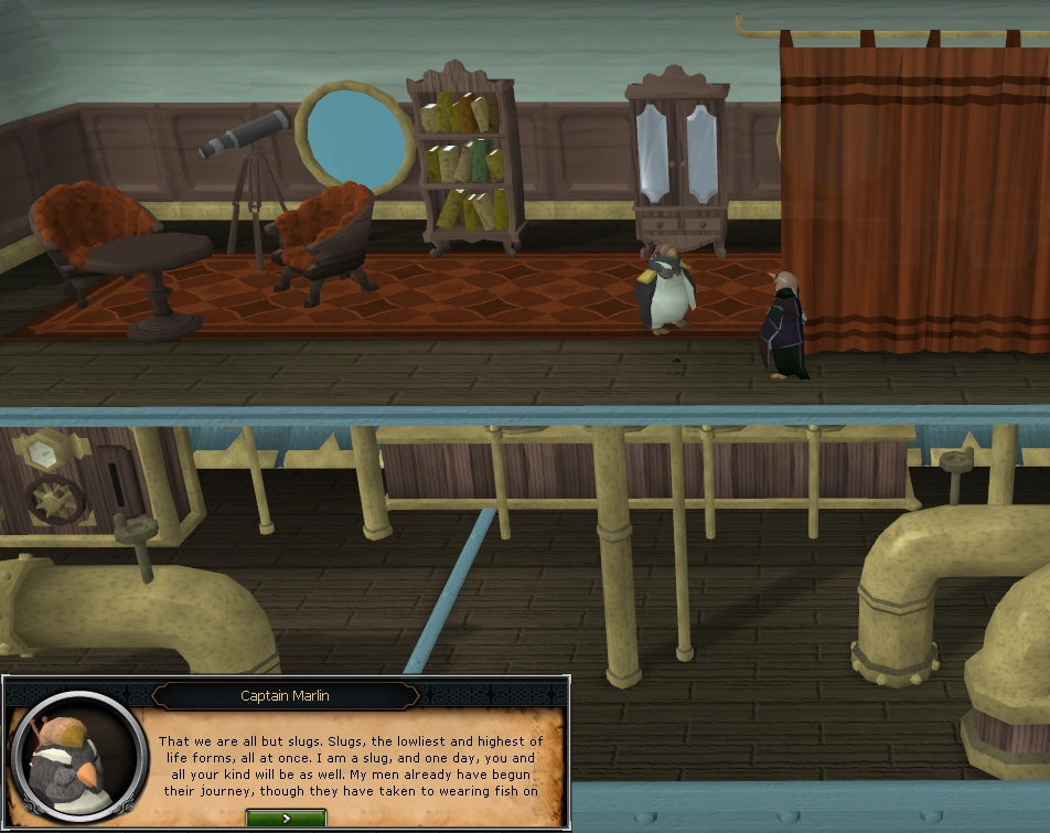 Enter the cabin, and Captain Marlin, acting oddly, says you have returned to destroy him. Choosing the Honest or Lie option makes no difference, as both produce a rambling lecture from the captain about how penguins will never achieve world domination over humans and polar bears and must become one with the sea. Eventually, Captain Marlin comes out from behind the curtain with a slug on his head. After growing tired of you, he sends you to the brig and confiscates your toolbox.