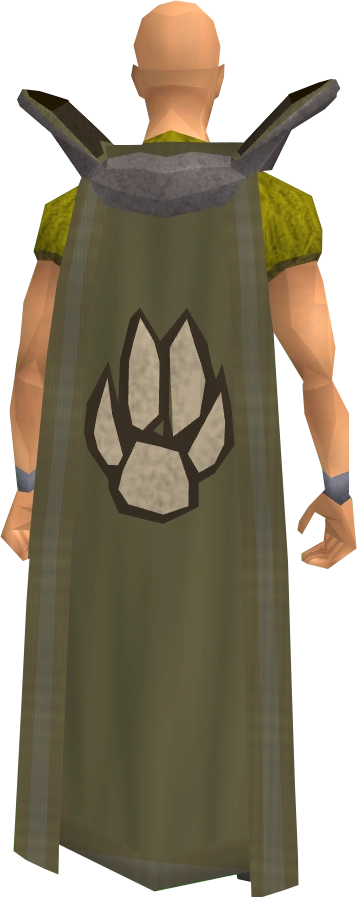 The Hunter cape is the Cape of Accomplishment for the Hunter skill. It can be purchased for 99,000 coins alongside the Hunter hood from the Hunting expert located in the Feldip Hills, by players who have achieved level 99. Hunter capes are brown in colour and have a dark brown trim if the player has more than one level 99 skill.