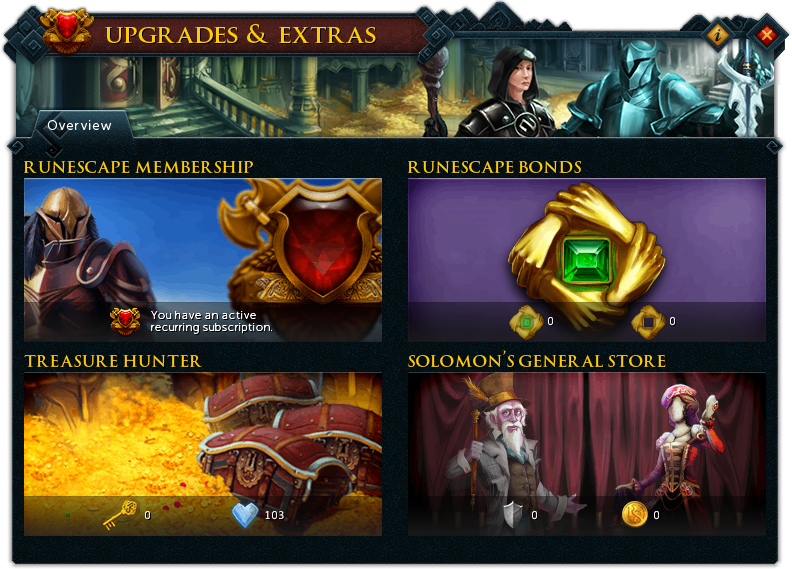 This tab contains all your cosmetic overrides, and overrides that you haven't unlocked yet. Most of these outfits can be bought in Solomons General Store. Some are unlocked by various content in-game (some of which are discontinued). You can recolour most overrides by clicking the recolour button when an override is selected. The following categories can be found in the menu on the left: