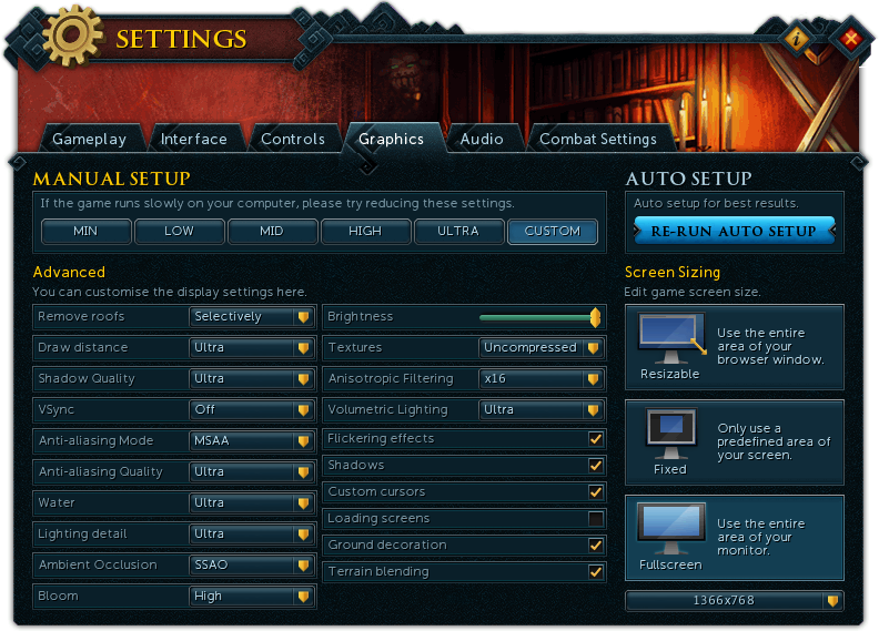 Finally, there are options to size your screen. The fixed size keeps the game interface at exactly the same size, no matter if you extend the playing window or not. The resizable size lets you make the game window bigger or smaller, which adjusts every other interface to cope well with the resized window. Lastly, the fullscreen size lets you play RuneScape in the biggest size. This option is only enabled to members.
