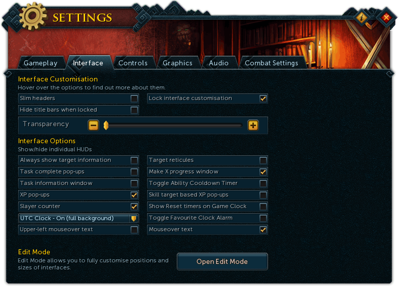 With the release of RuneScape 3, players are given the option to customise the layout of their interface. Most windows can be moved, resized, combined, and hidden. In addition to layout, players have the option to change a number of the more technical details such as keybinds and HUDs.