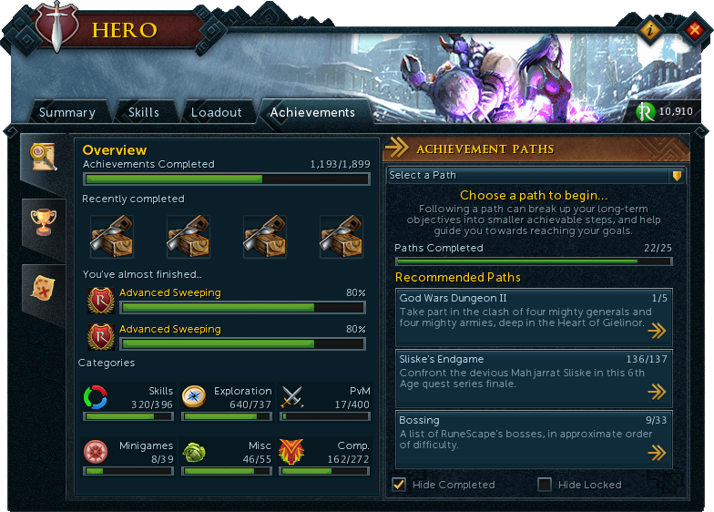 The Achievements tab lists all the available Achievements, grouped under skills, areas, PvM and completionist categories. There is also a toggle to hide the completed Achievements that also applies to the aforementioned Path System.