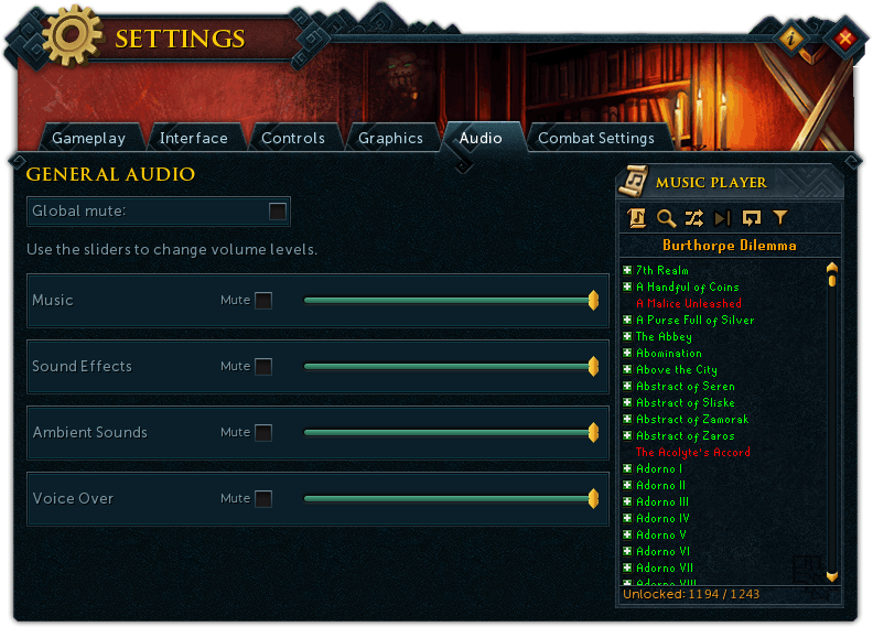 The volume of each category of audio can be adjusted with the sliders, where the rightmost point is the loudest volume and the leftmost point mutes the respective audio category. Among this, one of almost a thousand music tracks can be selected (assuming they are unlocked) and be played through the Music Player. Songs are unlocked either by default or from accessing new areas throughout RuneScape and can be added to a playlist, where selective music tracks can be played in a random order.
