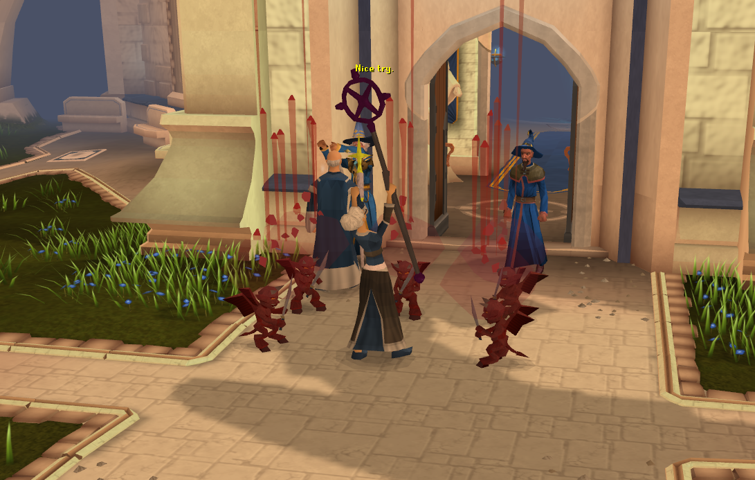 She will attack both you and Dionysius with Blood Barrage, which can hit high AND heal her, so use Protect from Magic at all times. First, attack her with ranged. Remember to run around the room! She will summon flames every few seconds and if you do not move quickly, they will very rapidly hit 30-40 life points every game tick, which cannot be blocked. Eat when necessary and continue attacking her. When she yells "Aha!" she will create a fire around her, destroy one of the statues, and teleport onto it. At this point, she will use Protect from Missiles if you range and Protect from Magic if you are using spells. Dionysius can still damage her, but you cannot. Now, she will also cease to attack but will summon flames about every second. Equip a melee weapon, preferably a dragon halberd or better; otherwise, you must stand as shown in the image and get hit by a lot of flames. Make sure you keep one square between you, or she will kick you and summon a fire under your landing spot (you cannot move for a short while after a kick). When she's lost enough health, she will teleport back to the ground. Attack with ranged again until she goes to another statue plinth. After the last statue, she will still attack with Blood Barrage; her flames will become less frequent (one every ~6 seconds) but will cover a larger area, about 6x6 squares. Run from one side of the room to another while shooting arrows at her. When she is defeated, she will be on the ground in front of the throne and you can talk to her.