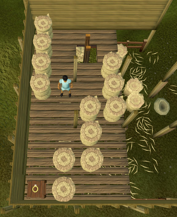 Talk to Mabel in the barn northeast of Draynor Village and northwest of Fred the Farmer (directly east of the Draynor lodestone). She will be crying and cannot stop until she gets her ring back, which is just upstairs. She cannot get it herself because she is "too distraught." Agree to help her find the ring and climb the ladder just northwest of her. You will appear in a small maze of hay bales, with the ring at the other end. You can push one or two bales at a time to reach the ring, which is fairly easy. The solution is: