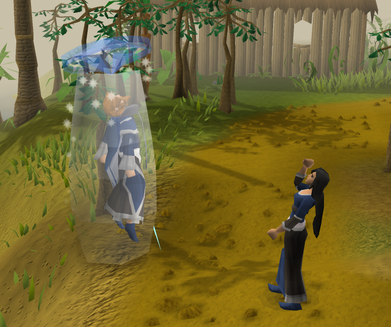 After you have defeated her, Dionysius will tell her about the Draynor Bank Robbery and that he is a self-centred battle-mage like her, and she will confess also having missed him and they forgive each other. There will be a cutscene and you will return to Draynor Village. Ask Zenevivia about Mabel's ring. She will inform you that she and Dionysius will plan to rob the Wizards' Tower to replenish their depleted supplies, and they tell you to watch from the telescope. She will also not give you the party hat Dionysius gave her as "borrowed items cannot be traded". Go upstairs and look through the telescope and watch the Wizards' Tower Robbery. After defeating all the wizards, they are attacked by a giant familiar Thingummywut, summoned by the seemingly incompetent Traiborn. Players cannot see it, but they can see the incredibly rapid Earth Surges it uses to attack. Upon their return, ask about the robbery and then for Mabel's ring, and your rewards will be given and explained to you.