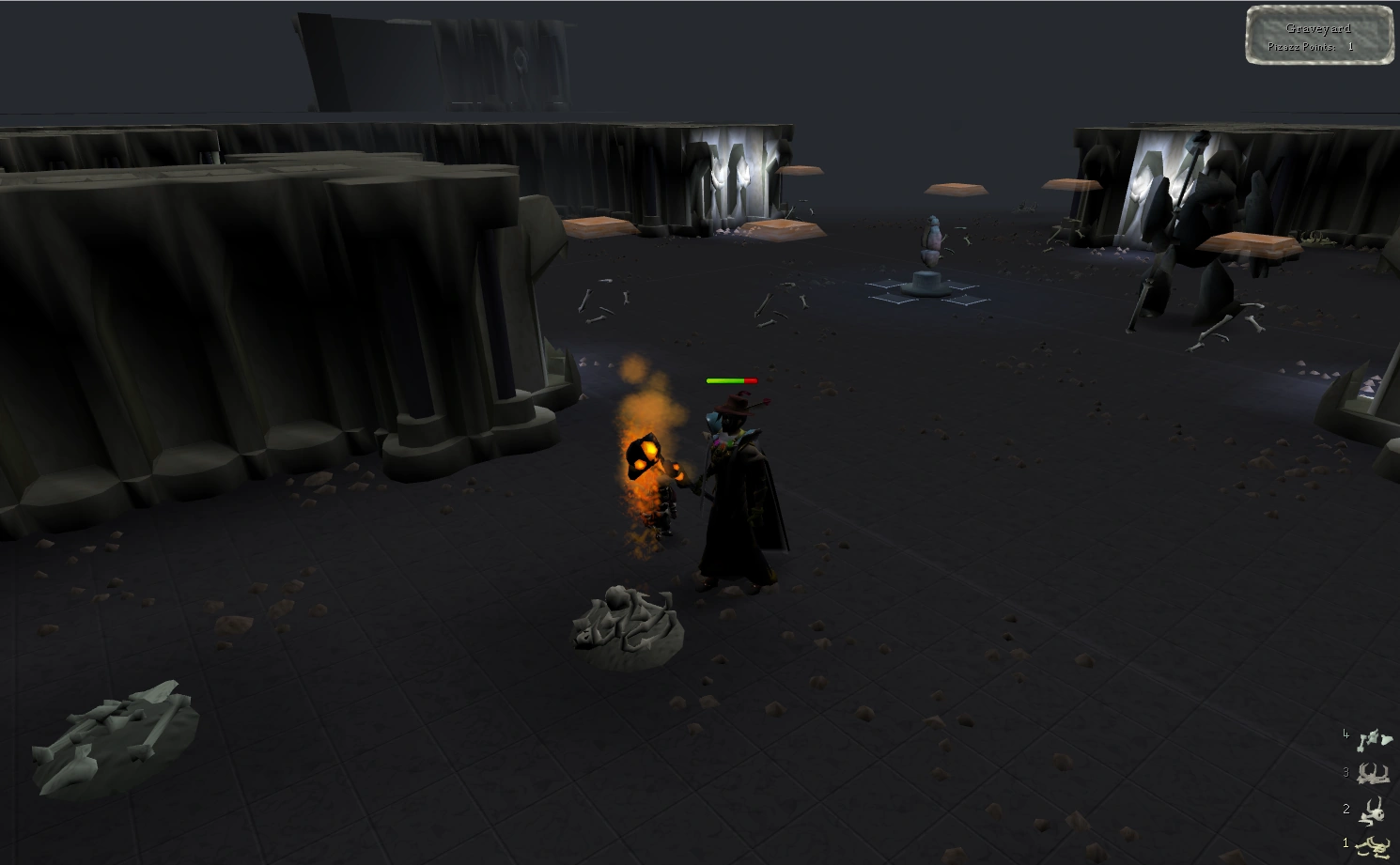Every so often, the player will be struck for 200 life points by falling bones. Protection prayers will not prevent the falling bones from causing damage. Upon death, the player will be sent back to the arena's main hall and lose 10 graveyard pizazz points. The player will not lose any equipment. Logging out in the room will not affect the pizazz points, but the player will lose all fruit in their inventory. You can also bring food into this minigame.