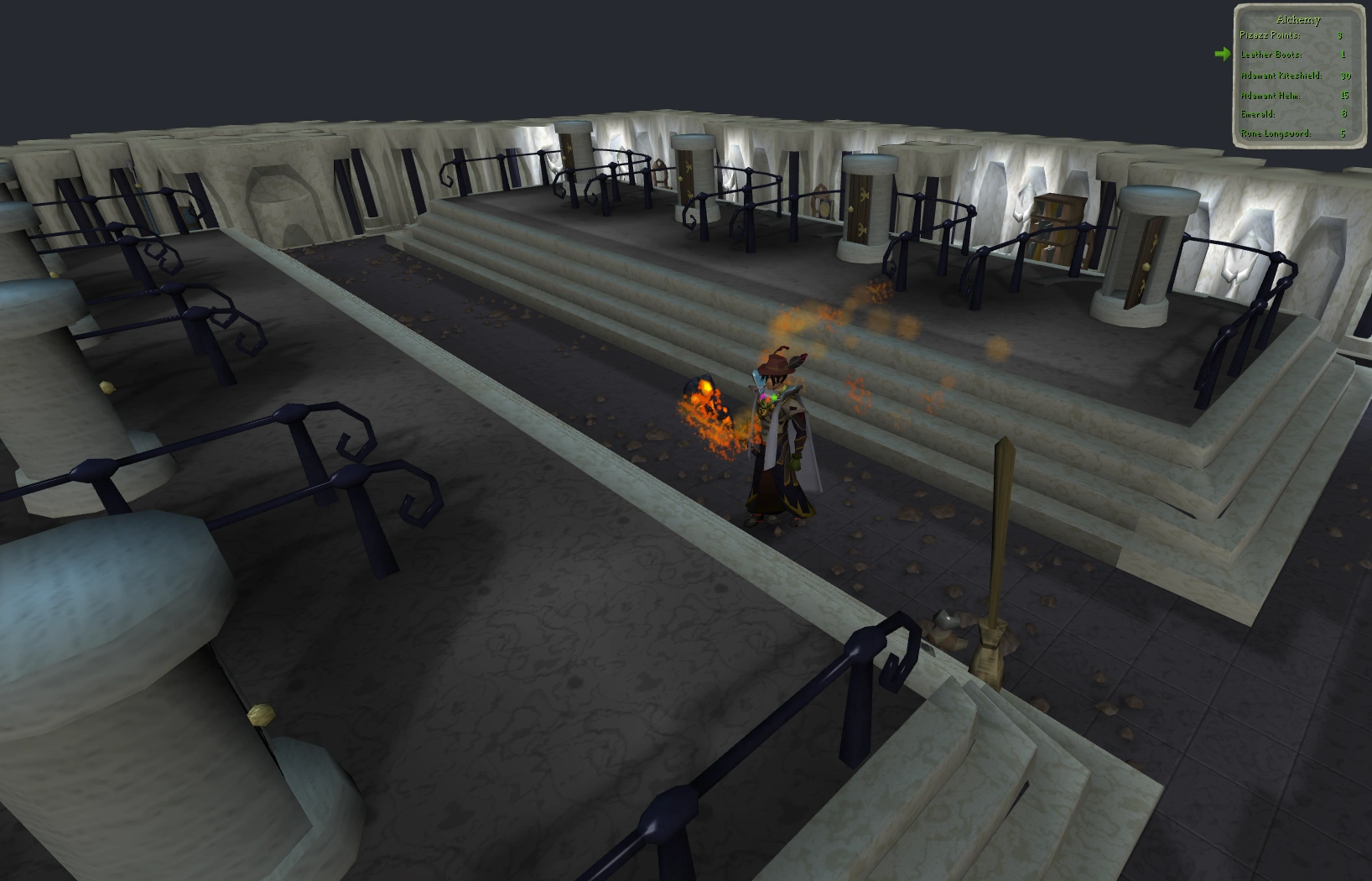Players cast high level alchemy or low level alchemy spells to convert five items found in eight cupboards to gold coins. Approximately every 40 seconds, the items rotate clockwise from cupboard to cupboard. The items keep their relative positions as they move. The alchemy value window in the top-right part of the screen shows the order of the items: