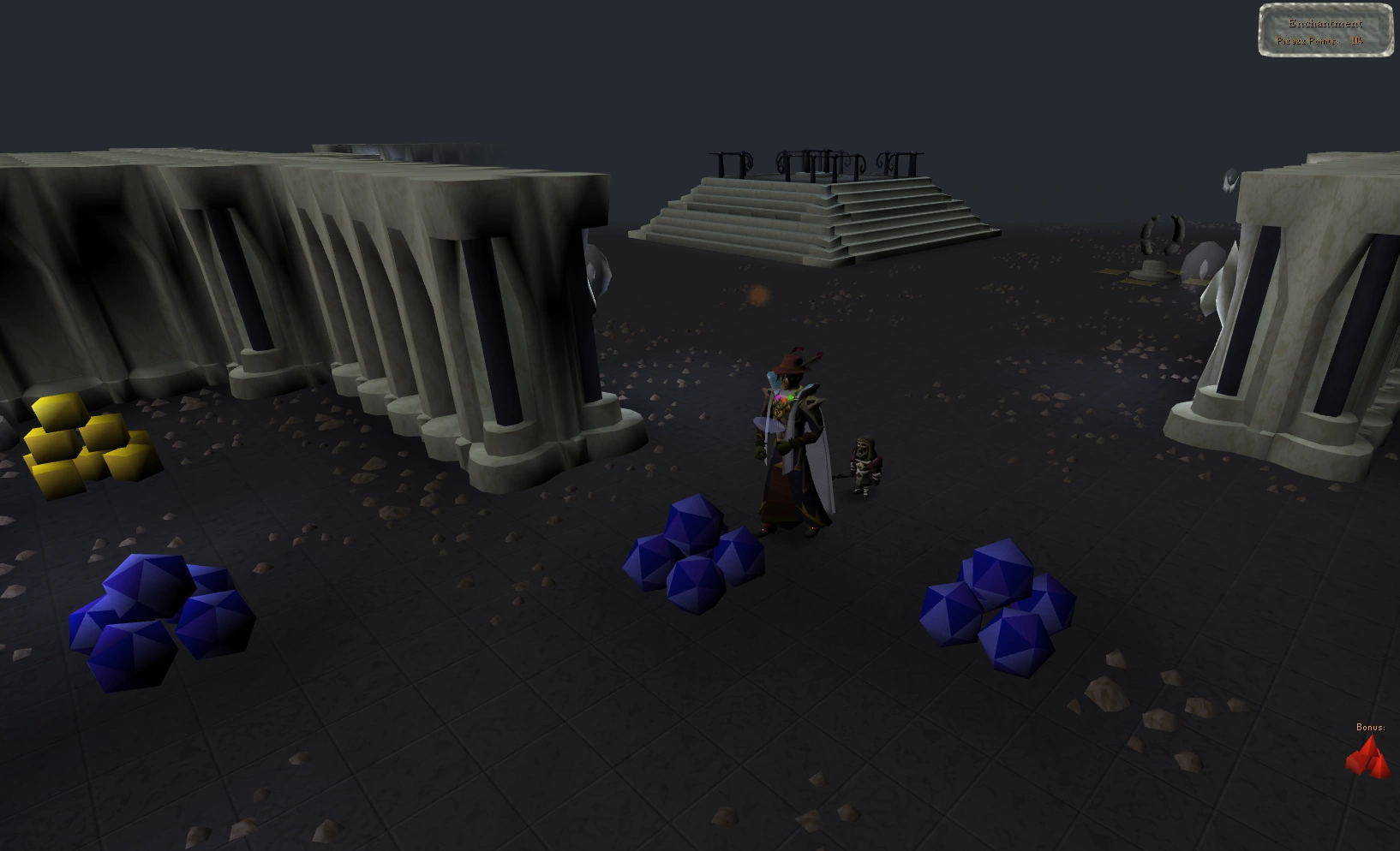 Players cast enchant jewellery spells to enchant various shaped items (blue Icosahedron, yellow cube, red pentamid, and green cylinder) located in the four corners of the room into orbs. In the minigame interface an icon indicates which bonus shape to transform if the player wishes to gain pizazz points. These shapes will transform into orbs, granting one pizzaz point per cast. All magic experience is reduced to 75% the regular amount in this room.