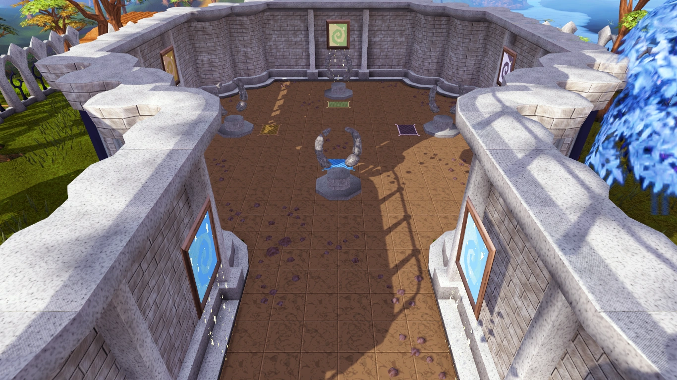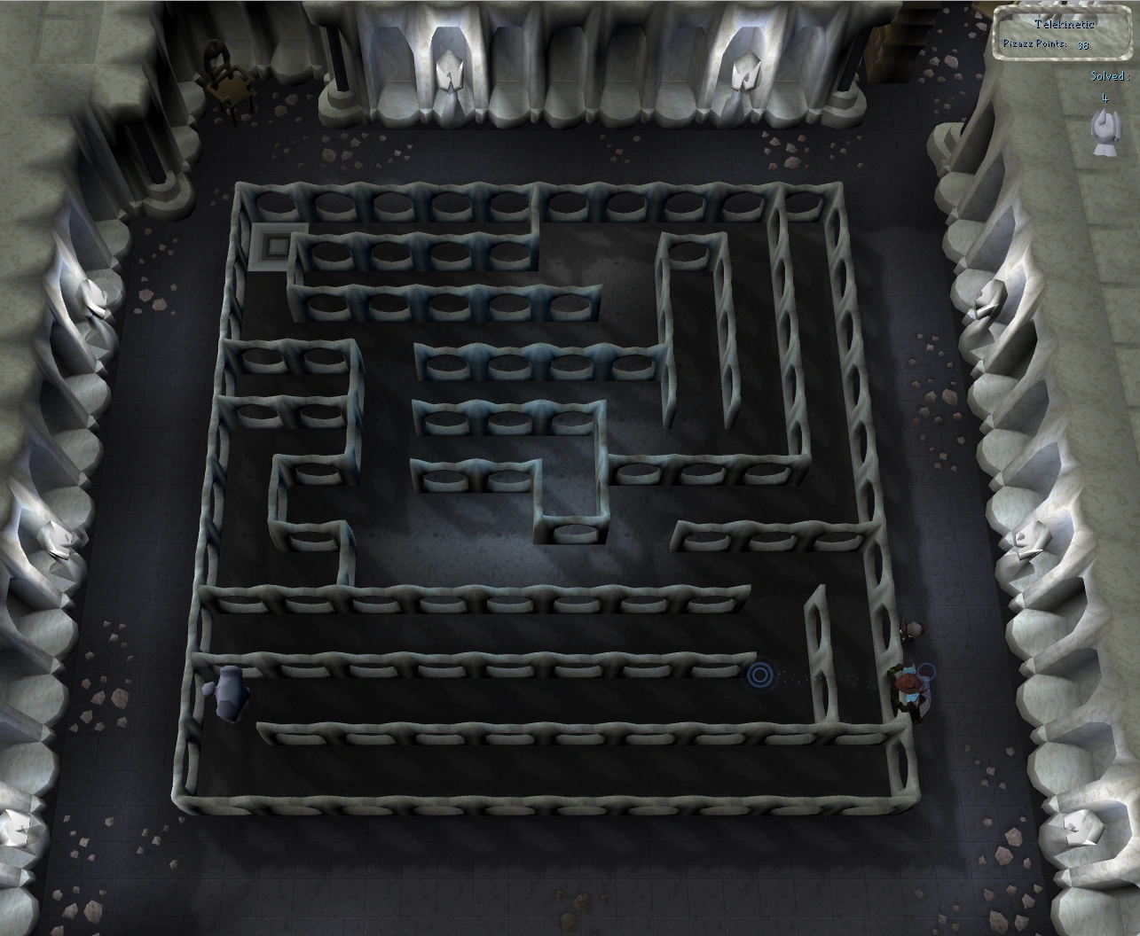 In this room, players can speak with the Telekinetic Guardian, who can explain how the Telekinetic Theatre works. Players use the telekinetic grab spell to move a statue north, south, east, or west through a maze. To move the statue, players must stand on the side of the maze they wish to draw the statue toward and then cast telekinetic grab on the statue.