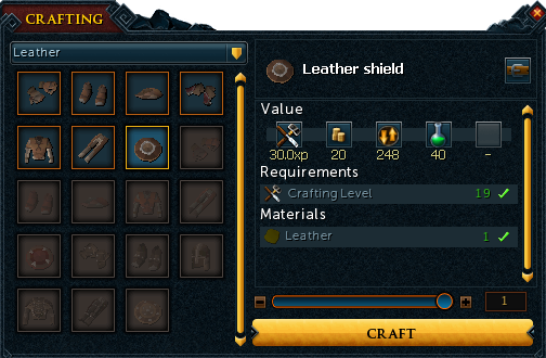 - On the left, a display of items under the same category (in the image, the category is leather armour).