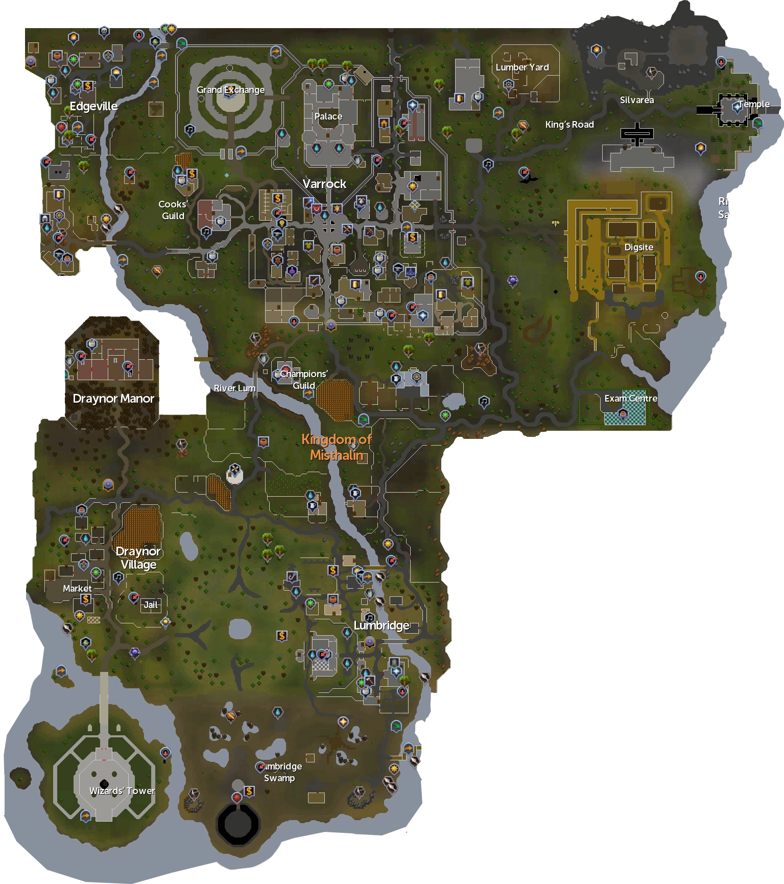 The Kingdom of Misthalin is a major kingdom within Gielinor, and is currently ruled by King Roald III and Queen Ellamaria. Misthalin is the most powerful human nation and by far the oldest, having existed prominently since the late Fourth Age, and its capital, Varrock, having existed in some form since soon after the end of the God Wars. Misthalin's primary economic activities are Smithing, Mining, and trading. It is divided in half by the River Lum, and its eastern border with Morytania is the River Salve. Most of its territory exists as Free-to-play areas.