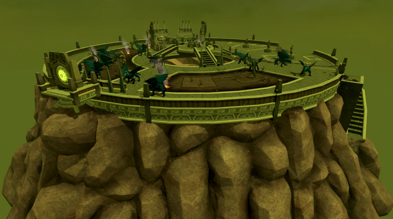 Mount Firewake is a great mountain located in the plane of Kethsi, and prior to the Adamant and Rune dragon update it was only mentioned in the Ritual of the Mahjarrat quest. It is accessed by the World Gate and right-clicking it for quick access. After the Stone of Jas underwent a six year journey to Kethsi, the inhabitants of the plane decided that the Stone should be placed upon this mountain by the Elder Mage Etheron, leader of the Mage Conclave of Kethsi. While the Stone of Jas rested upon Mount Firewake, it brought great prosperity to the realm of Kethsi and its people, though this was short-lived, as the Dragonkin were angered by its use by any others than themselves, and laid waste to Kethsi.