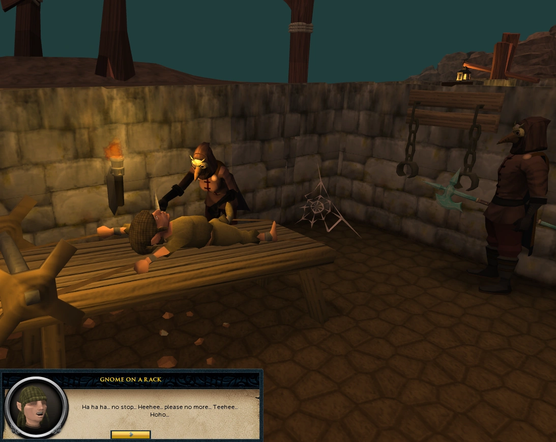 The head mourner gives you the broken device and a tarnished key to open the cell where a gnome inventor is being held for torture. Use the key to enter the cell, and speak to the gnome on the rack. Unsurprisingly, he refuses to repair the device and states that no form of torture will make him cooperate, not even having his eyelids stretched, his nostrils set on fire or his toes nibbled on by rabid rabbits. Having played gnomeball as a child, he is able to withstand all forms of pain. However, he accidentally discloses that he hates having his feet tickled and loves toad crunchies.