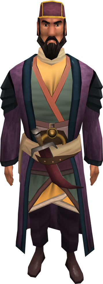 He used to be good friends with a Sorceress in southern Al Kharid though their relationship has soured to the point where she refuses to give him the sq'irks she grows, which he has a particular fondness for.[4] He rewards players who get him sq'irkjuice from the Sorceress's Garden with Thieving experience.