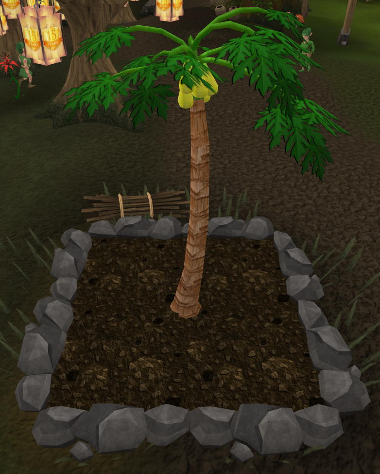 The papaya tree is a fruit tree that may be grown by the player with the Farming skill. Level 57 farming is needed to plant a papaya tree seed in a plant pot that has been filled with dirt from any gardening patch. A gardening trowel is needed to plant the seed, then it must be watered with a watering can. This action is all performed in the inventory or backpack section of the screen. A planted Papaya tree takes 960 minutes (roughly 16 hours, may take longer if needed) to be fully grown.