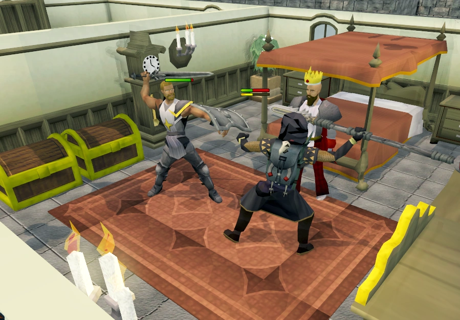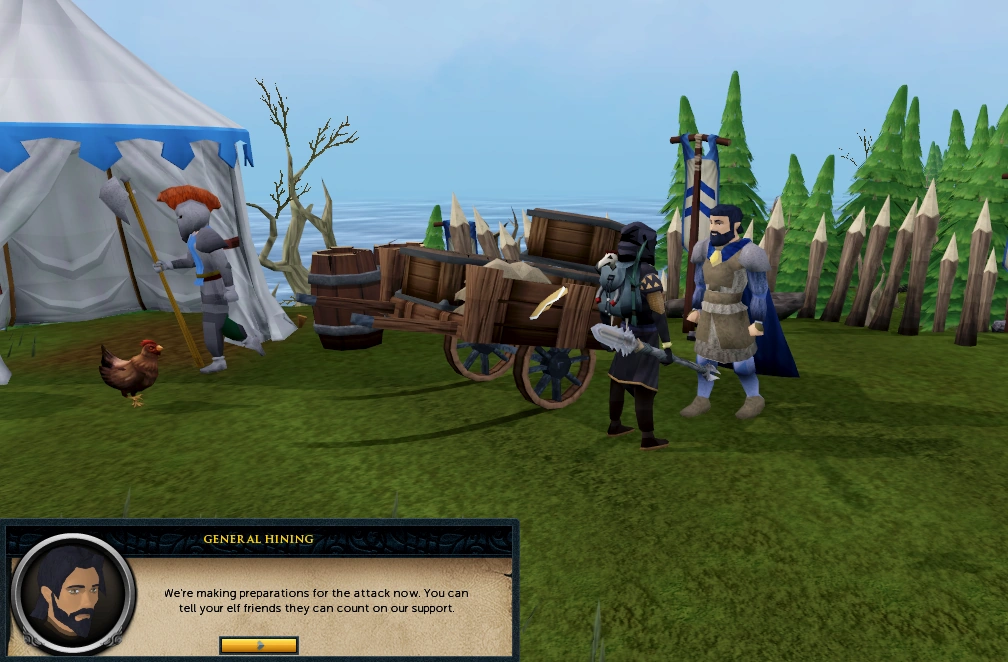 When all the mourners are defeated, Elena will give you a flag to replace with the flag on the roof of the headquarters. Head upstairs and plant the new flag, which will cause Sir Hugo, a paladin, and Sir Edmond, a Knight of Ardougne, to arrive at the scene and command you to leave the building at once.