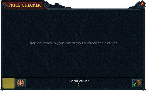 The interface is located within the Money pouch interface, upon performing a right click, and then left clicking Price checker, or simply left-clicking the money pouch icon. The price checker consists of small window in which items from the inventory can be added or removed, while actively displaying the total and individual current Grand Exchange market price or high alchemy price of each item(s). Switching between the Grand Exchange or high alchemy prices can be toggled by the icon at the bottom-left of the window. The prices of up to 28 different items can be checked in this interface. If a player clicks the price checker while having another interface open, a text appears saying: "Please finish what you're doing before opening the price checker."
