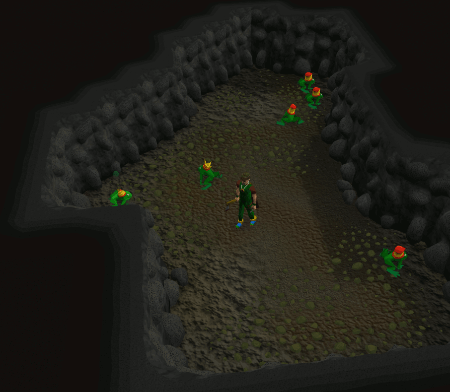 When the player got teleported to the Land of the Frogs, they had to speak to the Frog Herald, who told them how to solve this random event. The player then had to speak to the frog with the crown, and kiss him/her. If they talked to any other frog in that area he would tell them that is the wrong one and thus has to do over four more times. If the player fails them all he/she would be turned into a frog. The only way out was talking to the prince/princess and getting teleported to a random location.