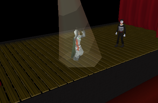 The Mime can now be found entertaining people in the Falador Party Room. Players are able to ask him for a joke, after which he will mime a very bad joke. You can also ask him how he is, among other things, and he mimes all of his responses.