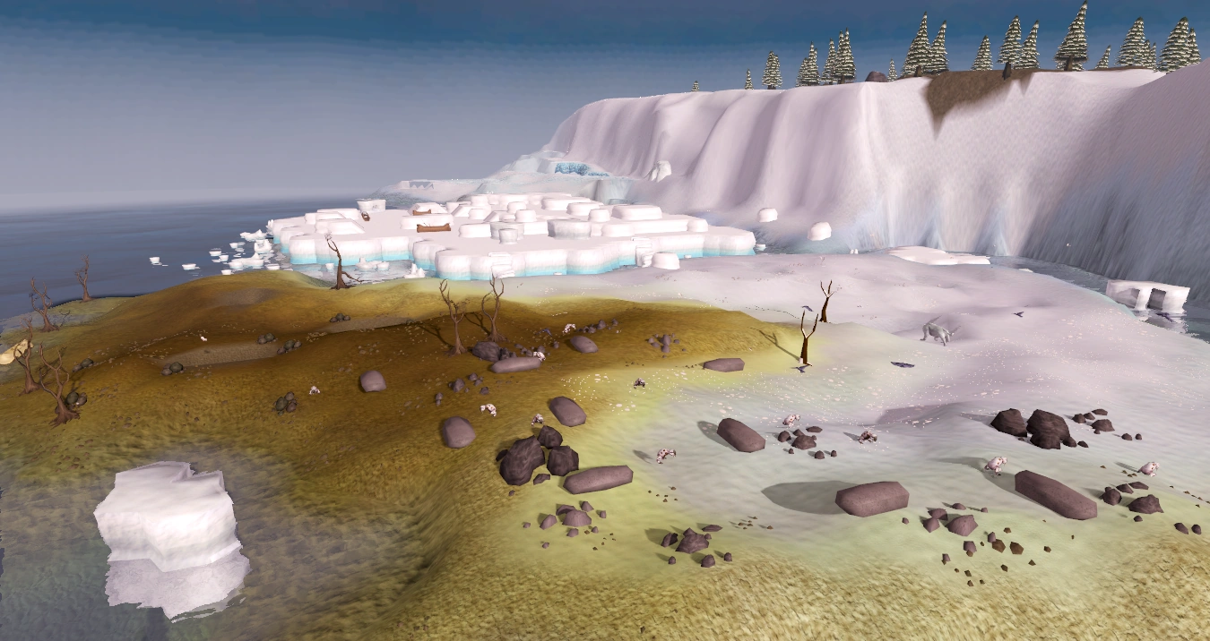 The Rellekka Hunter area is largely covered in snow and ice. In fact, the entire upper half is little more than a large iceberg. The southern half is made of solid land and can even support a few dying trees, but is largely covered in snow.