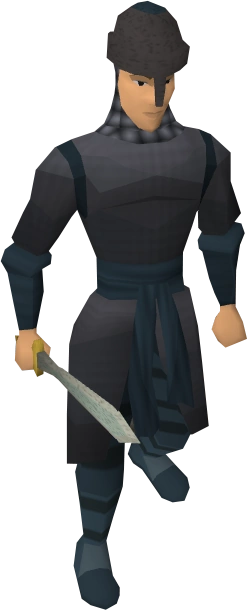 They appear to be wearing a different version of the Varrock guards' uniform. They are equipped with a dark variant of the helm and sash (around the waist), as well as wielding a similar short-sword.