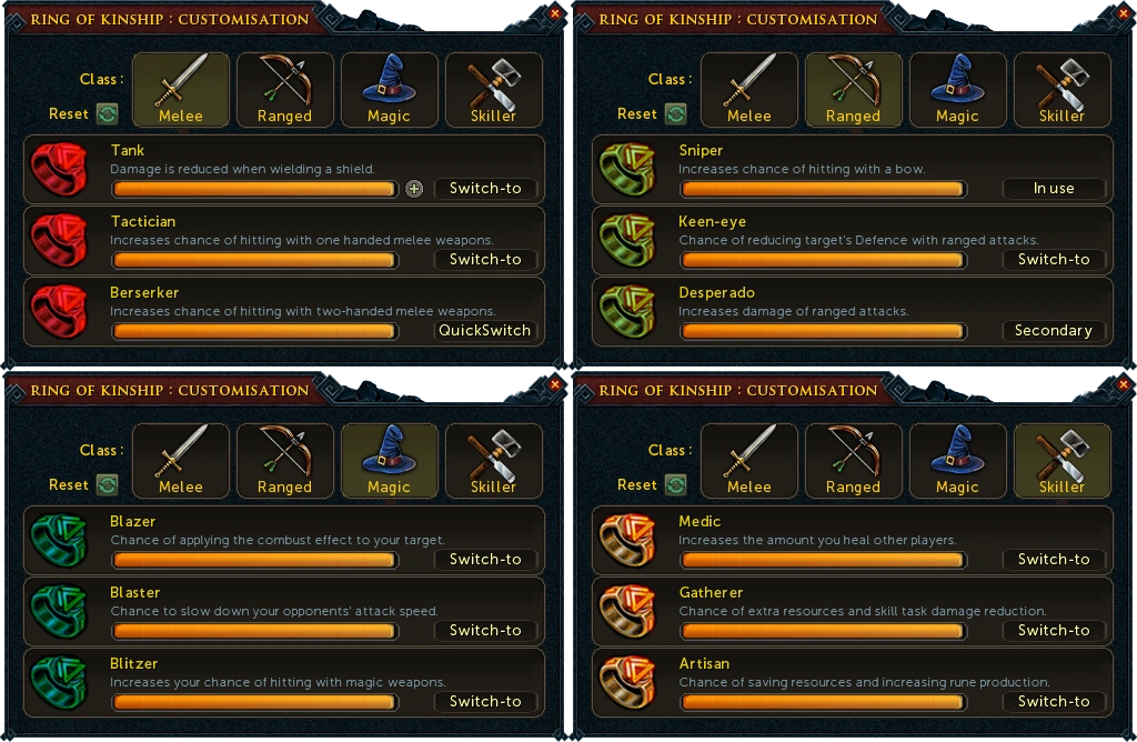 Members can customise their ring by purchasing class upgrades with Dungeoneering Tokens. There are 12 possible classes, and only one may be active at a time. However two classes can be activated if you have done at least the Easy Tasks of the Daemonheim set. In order to take advantage of the upgrades, players must wear the rings.