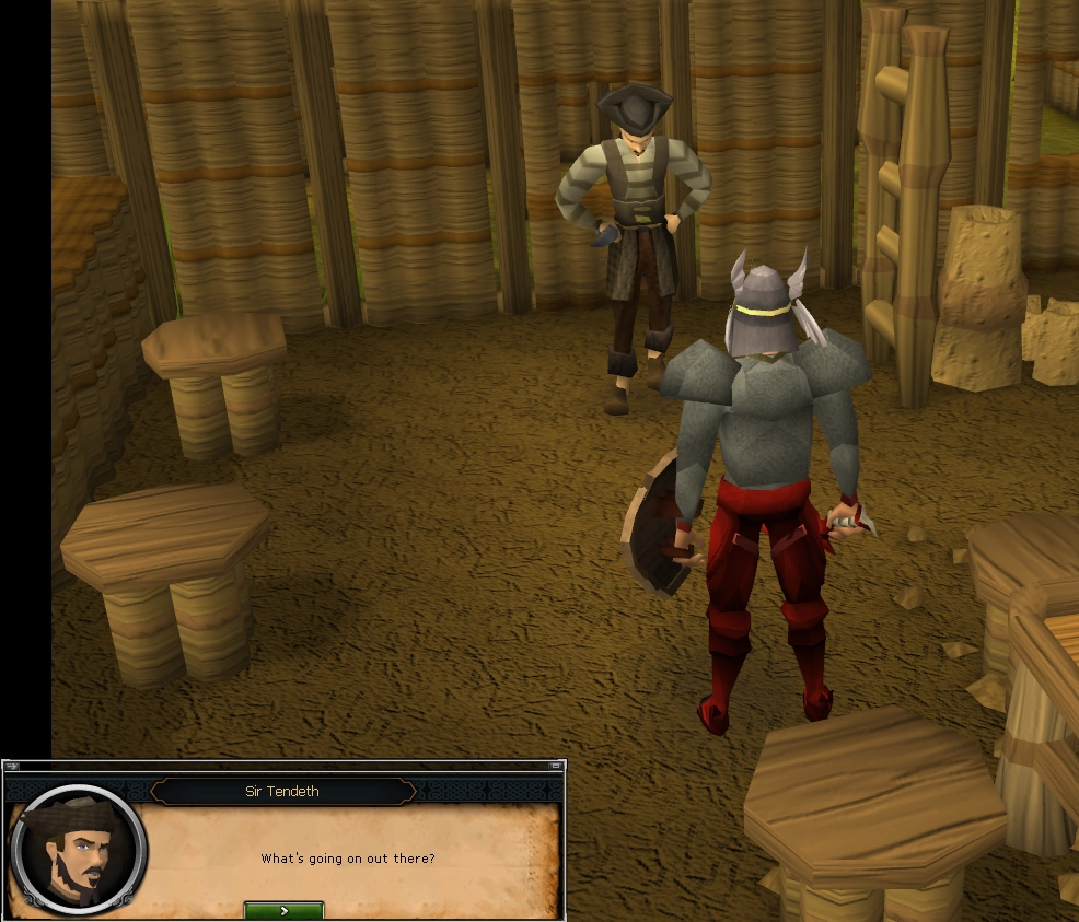 The screen will start shaking and a cutscene will show flashes of fire outside the inn. When it clears, some of the pirates outside will be lying injured on the ground. Speak to Sir Tendeth again and he will tell you to look outside to see if anyone saw anything, while he calms his nerves.