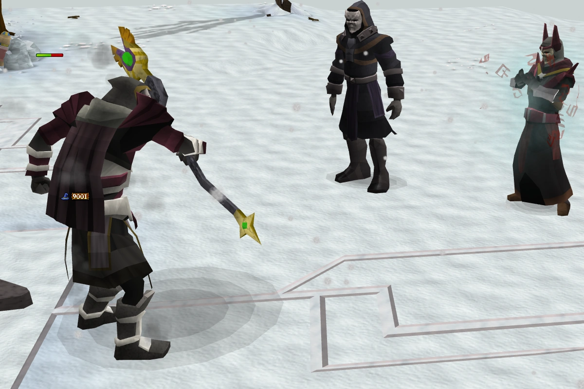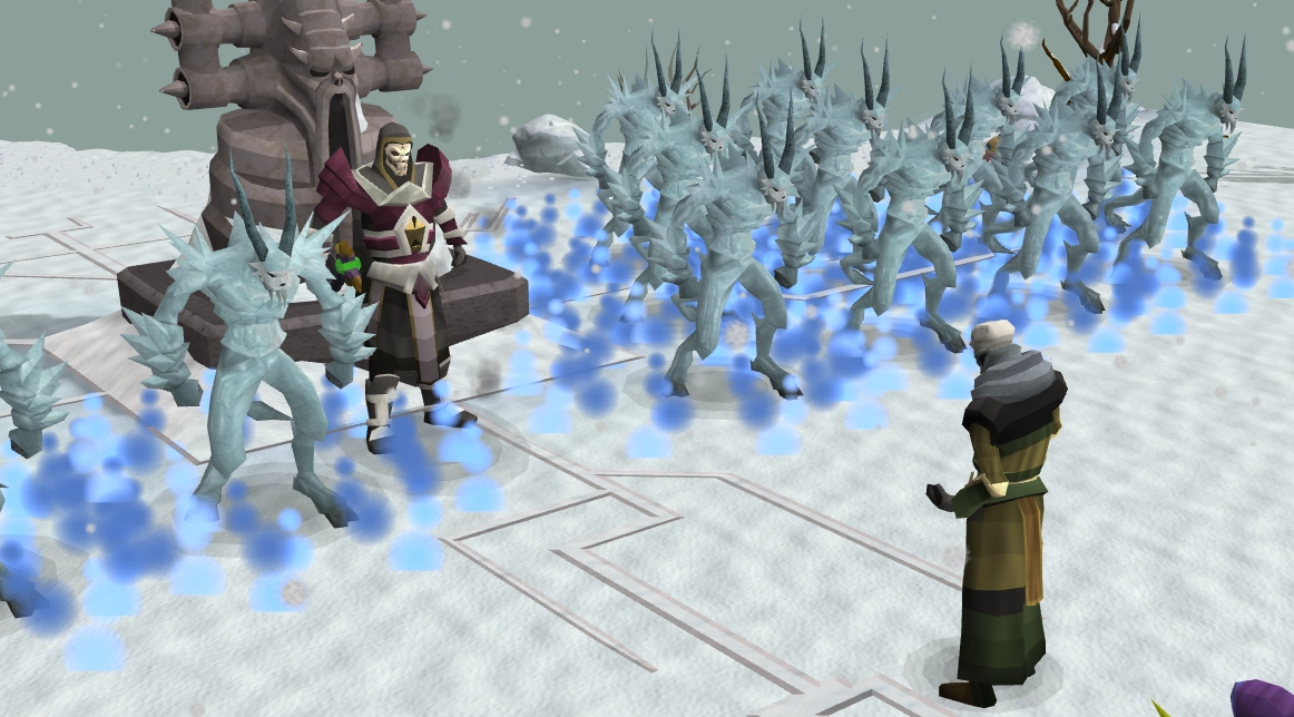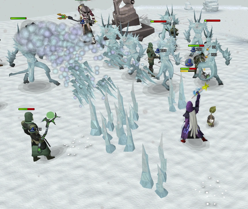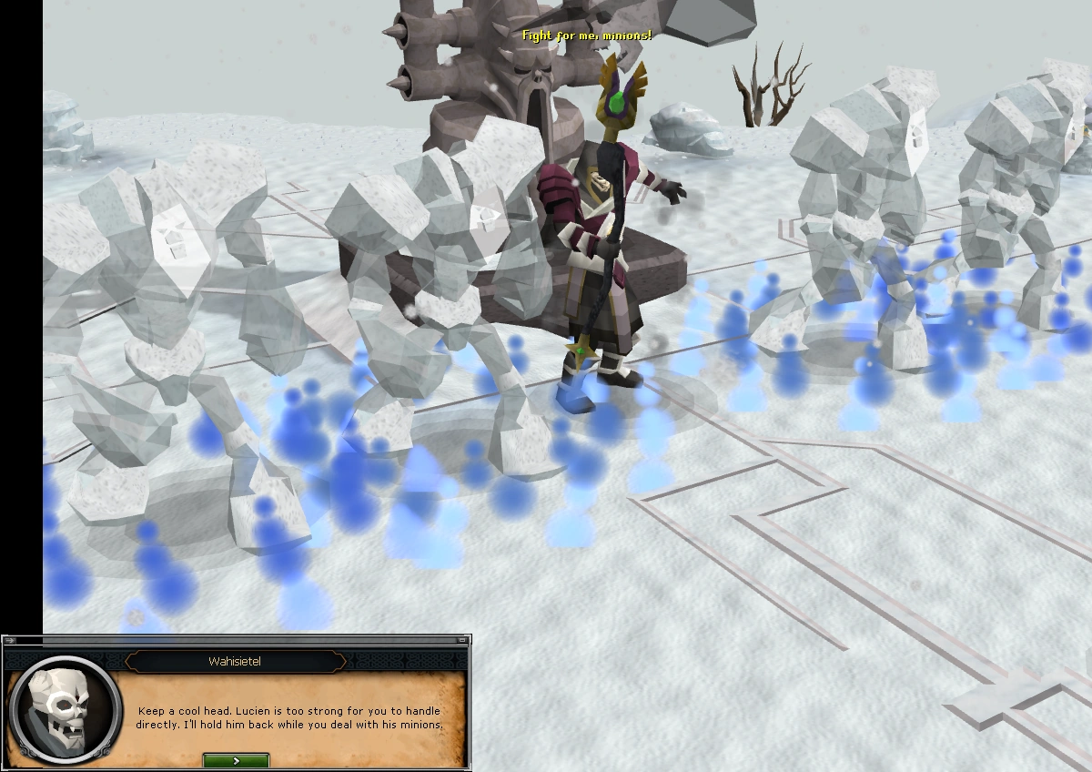 The ice demons use magical and ranged attacks, the magic attack being stronger. It is strongly recommended to protect from magic, as the demons frequently hit 300 against void equipment while protecting against range. Occasionally they will throw icicles that grow on the ground around you, which will block your movement. Protect/Deflect Mage will not prevent the icicles from forming. You can, however, attack an icicle to break it. It takes a combination of two "icicle attacks" from the demons to create enough to completely surround you, so move away from the icicles when they form. Ranging is recommended as your level will be significantly increased by the Stone. The special effect of the ruby bolts (e) works against the ice demons. Lucien will continue to cast his "black skull" spell at you during this fight, so it is very important to keep moving to avoid being surrounded by icicles when Lucien's spell hits. Combat familiars are not of use in this battle. Unlike the Ice Titan battle, familiars will not be attacked, so a Beast of Burden familiar may be safely used.