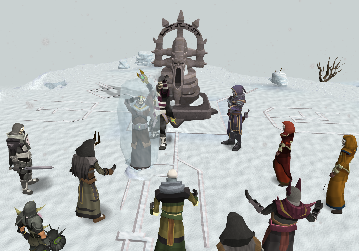Once the ice demons are killed, Lucien will grow tired of your attempts to stop him, and turn to a more important subject: the Ritual of Rejuvenation. At this point, multiple Mahjarrat will teleport to the ritual site, including Enakhra, who believes that her rival Akthanakos, who also appears, should be sacrificed in the Ritual. More Mahjarrat, including Zemouregal, Azzanadra, and General Khazard, will appear and argue over who will be sacrificed. Hazeel will also appear for players who chose to revive him during Hazeel Cult. Lucien decrees that as the most powerful Mahjarrat, he alone will decide who is sacrificed, and he pulls the frozen Jhallan from the cavern beneath, choosing him as the sacrifice.