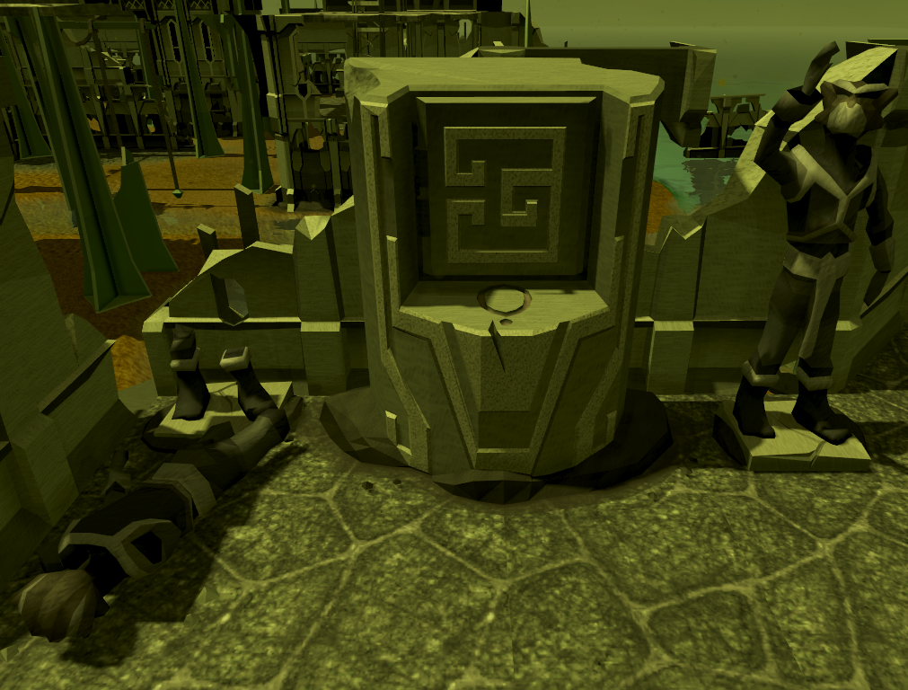 Avoid the undead broavs that wander the plain. If one sees you, a wizard will appear and teleport you to a cell in Zemouregal's fort. You can lift a tile at the east of the cell and then dig a hole. If you don't have a chisel and spade on your tool belt, search the bed. Climb down the hole and to get to get back to the ritual site, head north or east once outside of the building. When heading back to the plain, be aware there is one armoured zombie on the south-east side of the castle. A good way to avoid the broavs is to run around the edge of the map, although this makes positioning beacons more difficult.