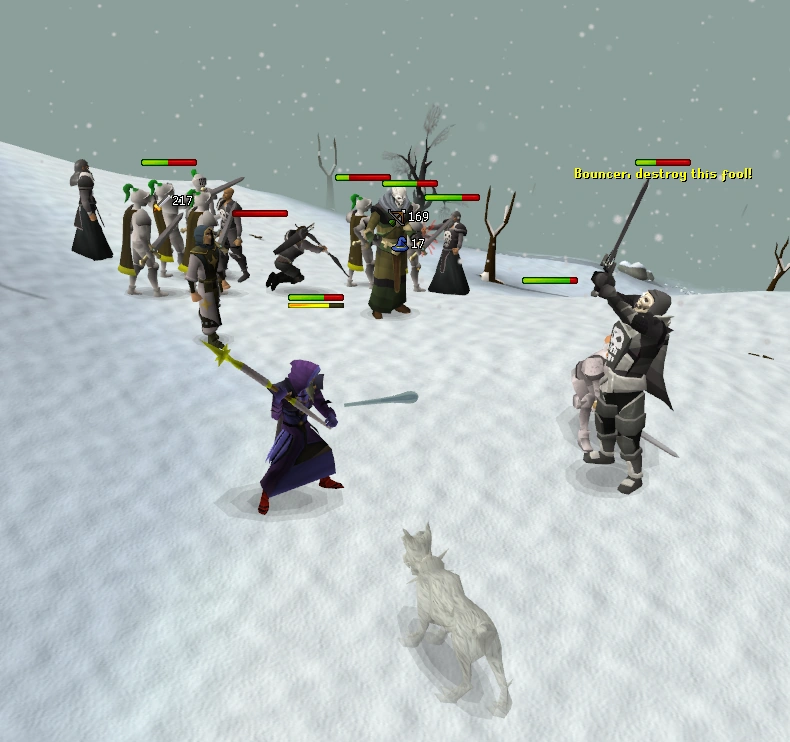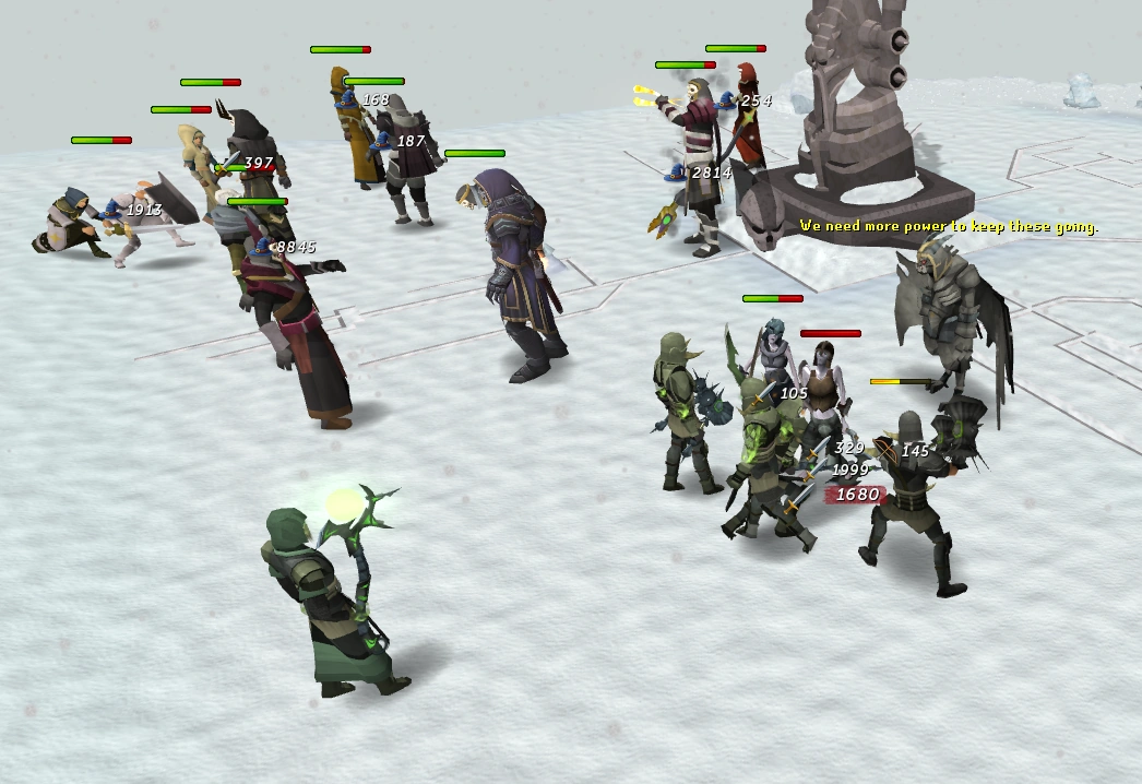 Another strategy, using range, is to run in a circle or crescent-shape around the demons. Run a few paces, fire a single bolt, then run a few more paces. This can be done either in a complete circle, passing to the north through the busy part of the battle, or in a crescent shape with two curves, running a curve from northwest to southeast or east, then going a few steps in/out and reversing the curve. The constant movement should reduce the risk from icicles and Lucien's spell while still getting in constant hits on the demons. This approach involves using the best range gear available (for high levels, black dragonhide is sufficient), a crossbow and ruby bolts (e), (if using the ruby bolts (e), you must use a level 70 crossbow), Protect from Mage (it is advisable to activate it before climbing the rope and starting the cutscene), 2-3 prayer potions, a healing familiar such as a Bunyip, and high-level food (sharks or even monkfish are sufficient at high levels). The main risk with this approach is making sure to watch your prayer points, as you will need to use potions to stay above zero. The player will still take some damage from range but will only need to heal occasionally if using a familiar. This allows the player to stay mobile.