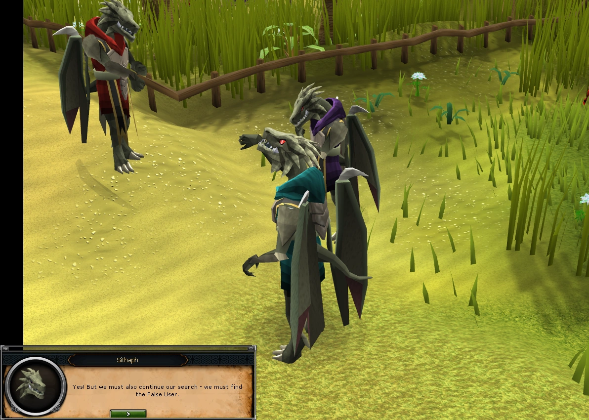 Once you reach the far edge of Trouble Brewing, in the eastern trees just north-east of the building, you will activate a cutscene. Sithaph, Strisath and Sakirth will be discussing how destruction eases "the rage" and say that it is still building, and that someone must be using "it". They decide to attack a larger settlement and that they must continue their search for the "False User". They then fly off, and you say you must report back to Sir Tiffy.