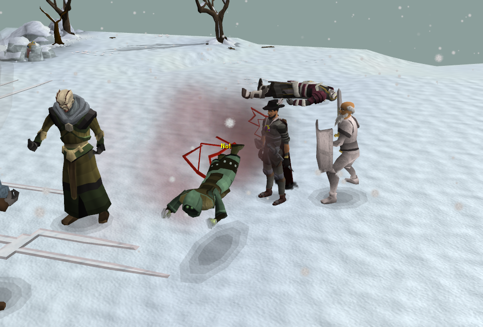 You'll duck for cover on the west side of a tropical tree. You'll then decide to run, using the trees as cover, to head east to where the fireball came from. The tall Jungle Grass also provides cover, up until you are north of Trouble Brewing, then you must use the trees. Follow the charred ground and burnt vegetation as a guide. If you remain in the open for too long you will be hit by a fireball and returned to inside the town gates with some heavy damage taken. If you use reasonable dragonfire protection, the damage should be around 800. If you're low on food while doing this, you can easily restock at the bank before going. You can hide on the small and large trees, but avoid clusters with plants as they can take you out of cover and make you get hit by a fireball. Ensure you wait a second or two before moving to the next tree otherwise the game assumes you didn't reach coverage and fireballs will strike you seemingly randomly. It seems like the music changes if you are out of cover, sounding something reminiscent of the Jaws theme. Wait for this to end before moving out of cover. Pay close attention as you near Trouble Brewing, as the pathing there can be quite odd. Hiding behind the building to the east does not protect you. The fireball will go through the building and still hit you.