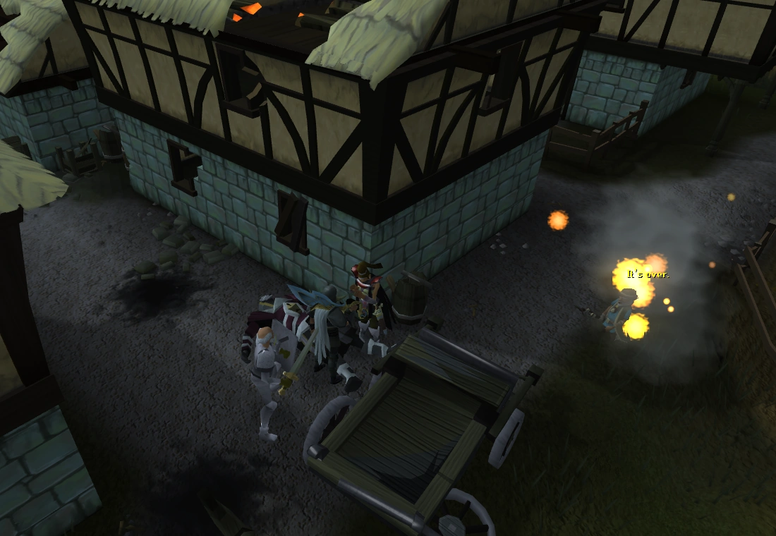However, rather than returning straight to Falador, you enter a burnt down version of Draynor. As the three of you run forward, dragonfire incinerates Thaerisk, just after he thought he saw Idria. And indeed, Idria, Duradel and Ghommal are standing there, but when each of the heroes are approached, they retreat and exclaim "We're already dead" before dying and disappearing. Going further will lead you to Lucien's body with Kuradal crying next to it, as well as another deceased hero, this time Hazelmere. In the next alley stands Sloane and Akrisae the Doomed walks by. Follow him to the bank, where suddenly Sithaph appears! After a short chase scene, the dragonkin hit and kill Tiffy, and wound you. They let you go, telling you this is a vision of the future.