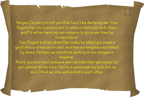 Make your way to Queen Sigrid, and inform her of what you learned about the teenagers and the sea snake. She gives you an apology letter to take to King Vargas, thus preventing a possibly devastating war. Head back to King Vargas, telling him too about the situation in the dungeons, and give him the Queen's letter to complete the quest.