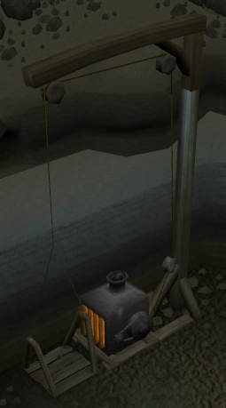 - Use a pulley beam on the broken scaffold on the east side of the room to attach it.