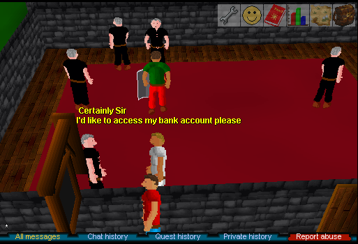 In RuneScape Classic, there weren't any dialogue boxes with NPCs. All the dialogue was yellow text overhead the player and NPC. A non-player character could talk to only one player at a time. That meant that the competition over who got to talk to NPC when a new shop or quest was released, was very high and it often took several minutes to finally get to talk to an NPC. That would also allow grieving for intentionally delaying the dialogue. There also weren't right-click options for shopkeepers, bankers etc. to quickly open the shop or bank screen.