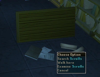 The Scrolls from the Defender of Varrock quest are on the floor of the library in the Varrock Palace. By choosing the Search Scrolls options, players can find a fragment of a document that contains a List of elders of Varrock.