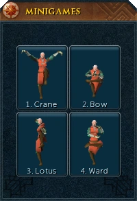 Players can begin this training method by locating the posts found in the Hefin Clan district around Lady Hefin. Players can use the Prifddinas lodestone and travel north, or may use the Hefin teleport on the crystal teleport seed (or its attuned variant) and travel south. Players are required to stand on any of the six posts. Then they must choose one of four poses from the minigame interface. The four stances are: Bow, Crane, Lotus, and Ward.