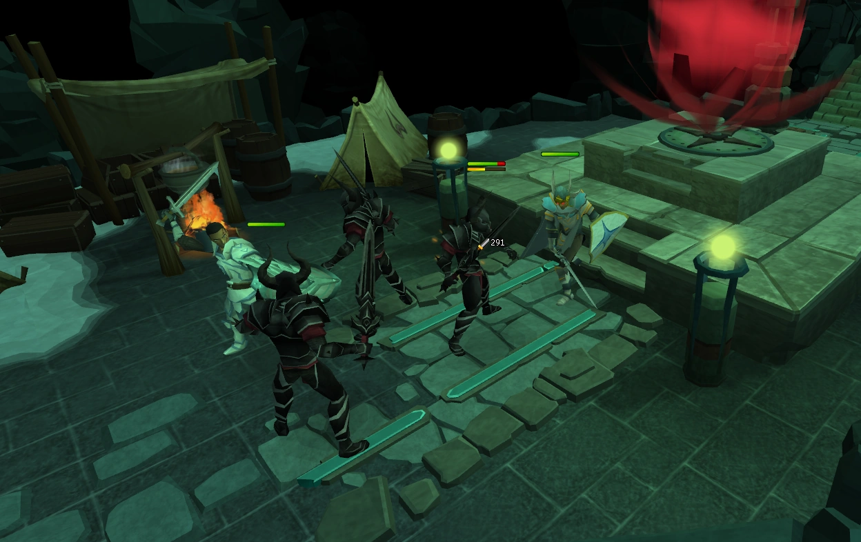 Saradomin revealed himself to be the contact and entrusted both Owen and the adventurer with the recovery of an ancient weapon from the God Wars - one the Kinshra, who had been raiding White Knight outposts recently, were very close to obtaining. He then proceeded to infiltrate the Black Knights' Fortress, disguised as a prisoner of the castle's overseer Captain Dulcin, who was being impersonated by the adventurer. After making their way to the third floor, "Dulcin" was informed by Lieutenant Graves that 'the ritual circle' had been damaged and 'the witch' had disappeared. The lieutenant was dealt with and the duo ransacked Dulcin's office before repairing the circle and completing a Black Knight ritual, which opened a massive red portal.