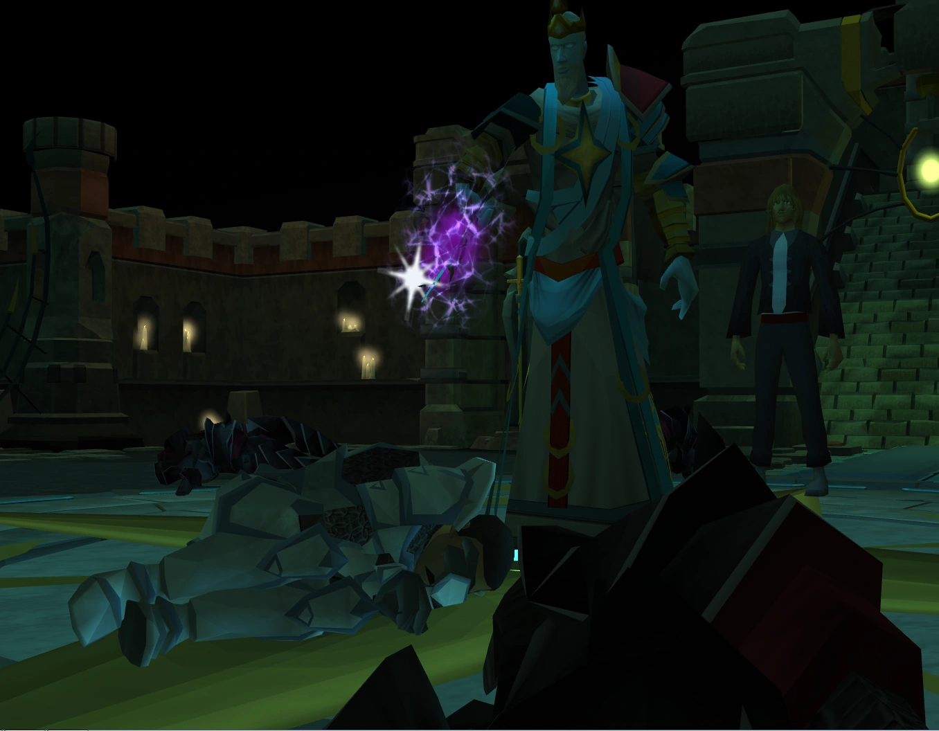He does not have a high Agility level, though, and does not use Magic or Runecrafting. He uses jewellery to teleport rather than casting teleport spells. He says his lack of magical experience comes from the Temple Knights' use of various magical gadgets, such as the commorb, although he has a decent academic and theoretical understanding of magic.