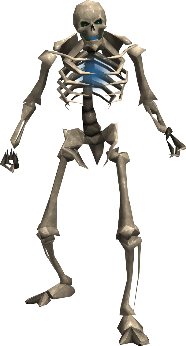 These Skeletons can be found in the sixth room of the Lumbridge Catacombs Dungeon which can only be entered after completing The Blood Pact quest. They are different from normal skeletons as they have a blue glow in their chest and mouth as opposed to a green one. They were created by Dragith Nurn, a now undead necromancer, during his experiments with stolen corpses.