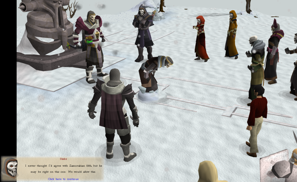 His power greater than ever and possibly in possession of the two most powerful Elder Artefacts, Sliske decided to host a game amongst the gods returning to RuneScape after the death of Guthix when he was ordered by Zaros himself to create a distraction for his return. To this end, he captured the Empyrean Citadel in the sky, where the aviantese of Armadyl once held court. He took it over with his wights and transformed the throne room into a stage for himself with podiums for several gods to stand on. He began planning his "Grand Ascendancy", an event at which he would announce his ascension to godhood to the gods.