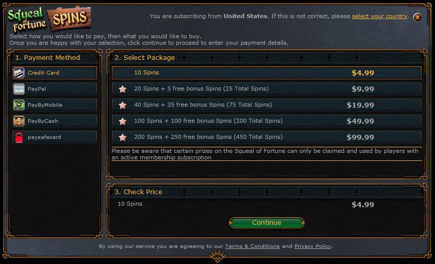 Spins can be bought in groups of 10, 20, 40, 100 or 200 spins, with a bonus 5 spins being given for buying 20, a bonus 35 spins for buying 40 spins, a bonus of 100 spins for buying 100 spins and a bonus 250 spins for buying 200 spins. A maximum of $200 US can be spent a day when buying spins and bought spins will expire after 6 months. There is also a second cap of $500 US a week so you can't spend $1400 US in a single week.